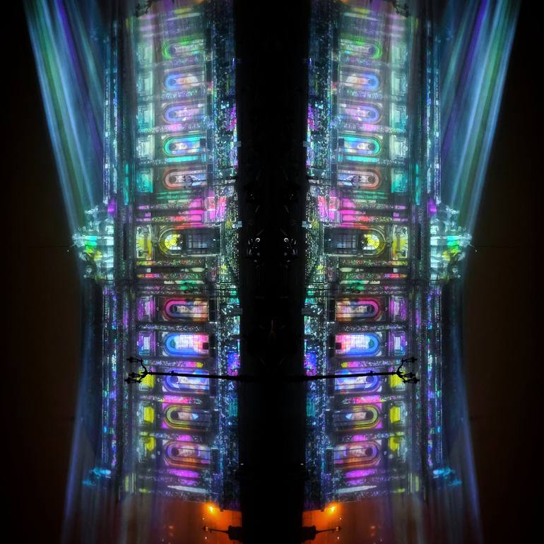 Chromatic Cathedral is a mesmerizing digital artwork that transforms the grandeur of Gothic architecture into a symphony of light and color. The piece depicts a mirrored façade of a cathedral, illuminated by cascading beams of vivid hues, ranging from electric blues to radiant magentas and soft yell...