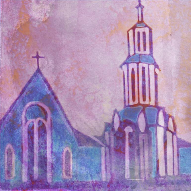 Churches ensemble in lilac blue under pink sunset sky. Abstract digital painting.