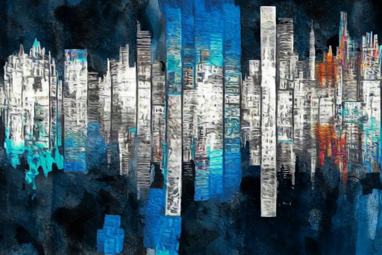 City in danger. Restless night. Ukrainian urban landscape. Abstract digital watercolor painting. Printed on high quality canvas of 90 x 60cm.