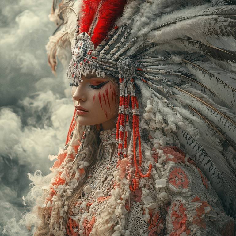 Tribute to strength, heritage, and timeless beauty. This portrait features a majestic American Indian woman adorned with a dramatic feathered headdress, its fiery reds and smoky greys creating an unforgettable visual contrast. The interplay of colors evokes the balance of fire and ash—passion and c...