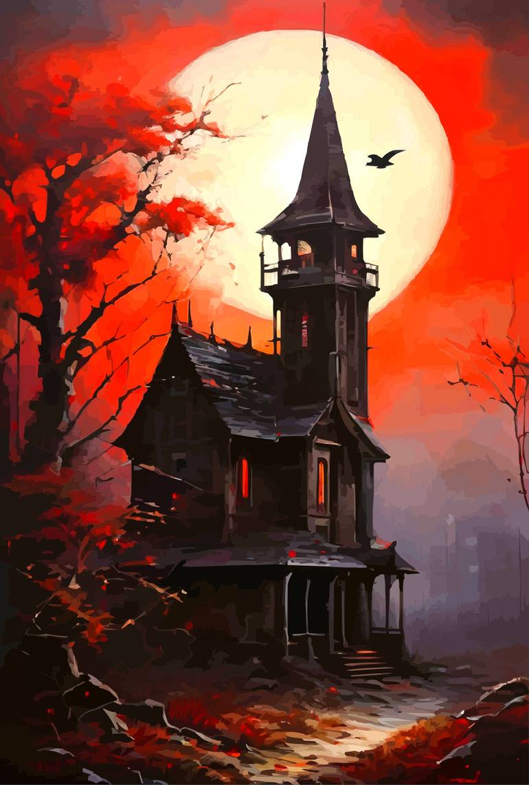 Series Title: "Moonlit Shadows: Black Fantasy Clock Tower". In "Moonlit Shadows: Black Fantasy Clock Tower", the artist invites viewers into a surreal cityscape where an ancient clock tower dominates the fog-covered medieval town. Each oil painting in this series masterfully blends elements of dark ...