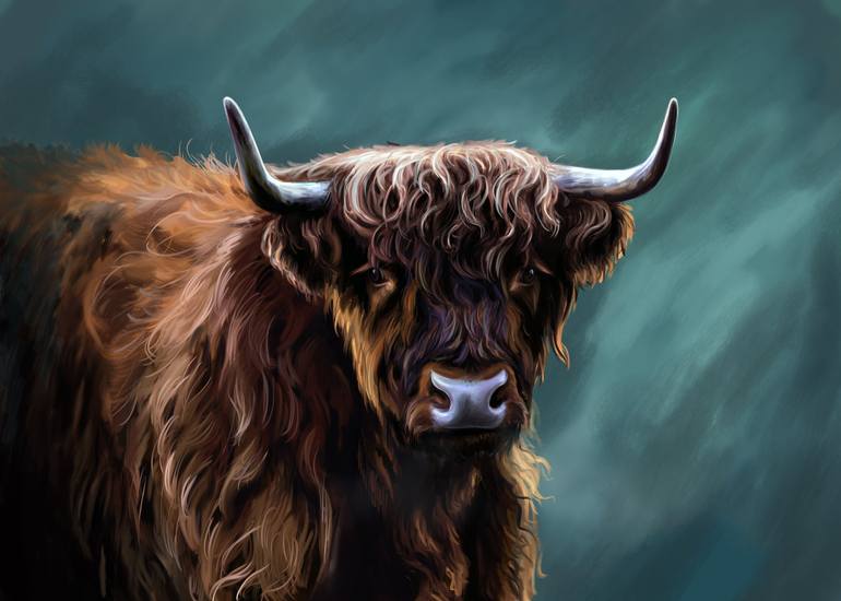 Digital painting of a beautiful horned Scottish Highland Cow. Follow me on Instagram