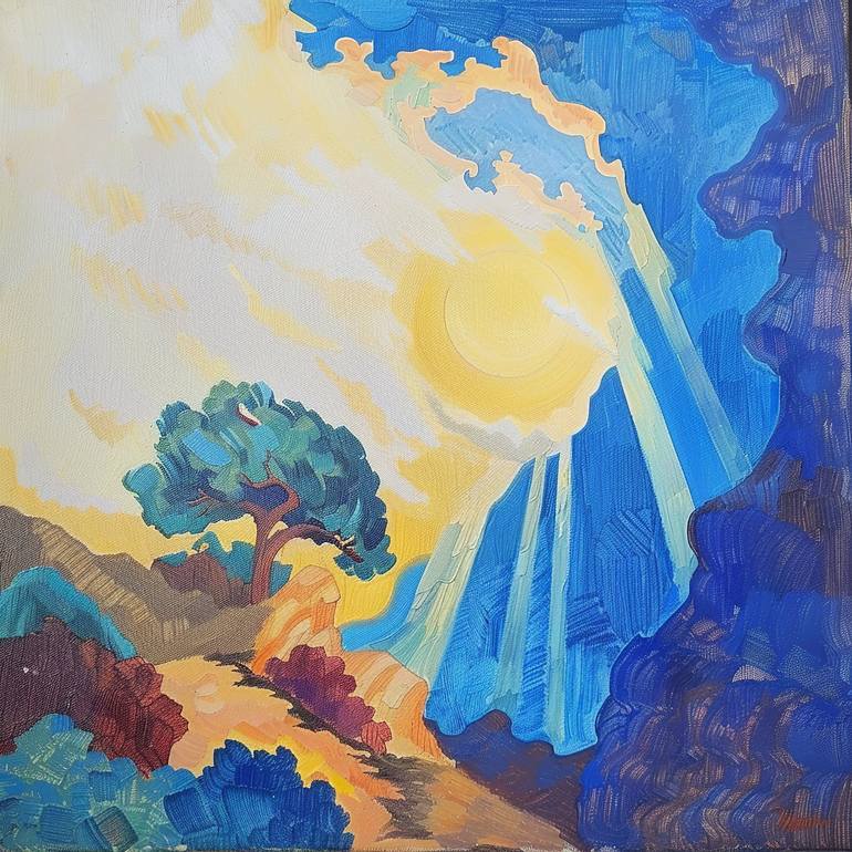 "Golden Radiance" is a mesmerizing landscape painting that captures the brilliance of sunlight breaking through the clouds. The composition features a single tree atop a hill, surrounded by lush foliage in shades of green, blue, and red. The sky is filled with dynamic sunrays in warm yellows and co...