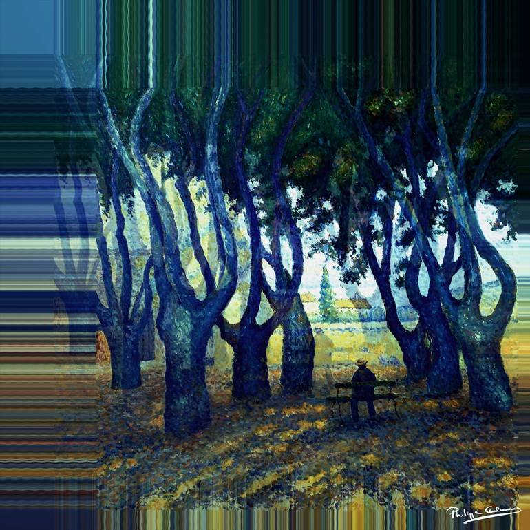 Echoes of Saint-Tropez reimagines the poetic atmosphere of Mediterranean trees through a personal digital code process. Drawing inspiration from pointillist harmony, this reinterpretation deepens the original mood into contemplative abstraction. The solitary figure seated among elongated shadows add...