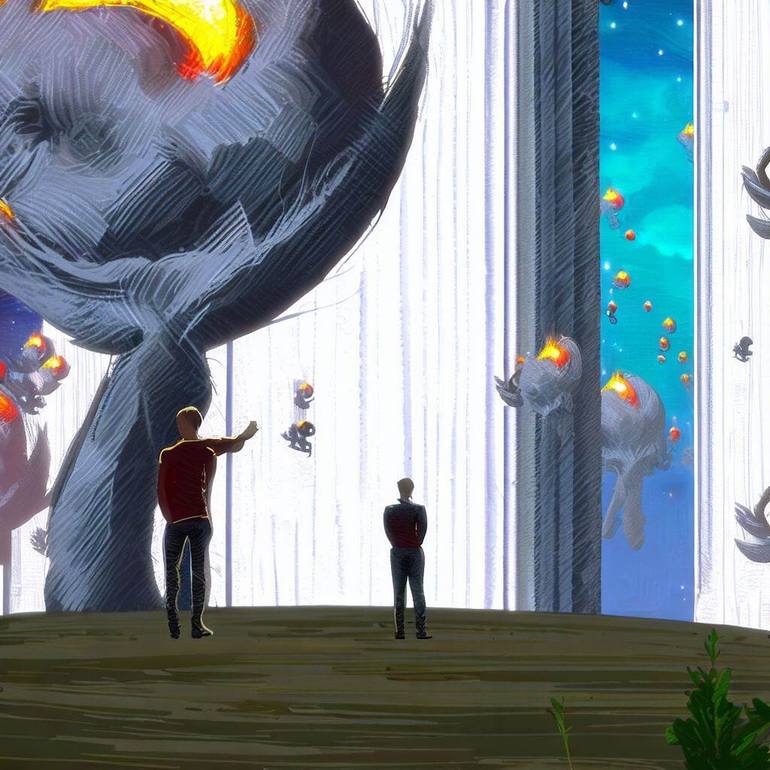 Before the vast tapestry of the cosmos, two earthly witnesses stand, one with hands outstretched, as if to caress or command the very fabric of the universe. The swirling celestial maelstrom before them births fires of creation, a potent symbol of the universe’s unceasing churn of life and destructi...
