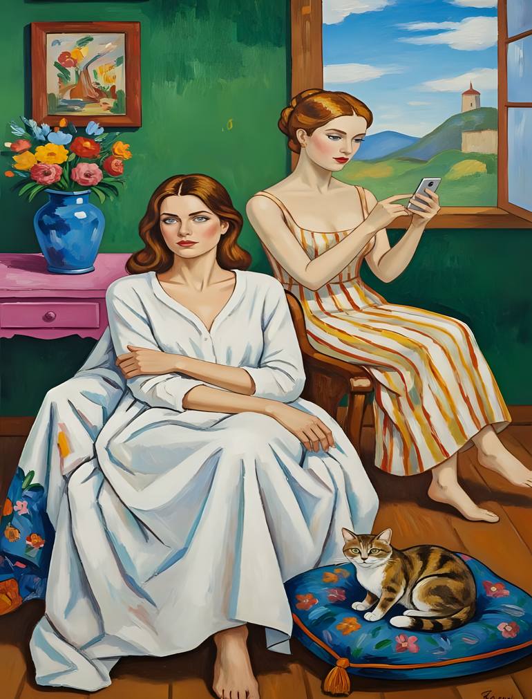 Tuscan Interlude (Original Painting on Canvas - Figurative / Contemporary Realism) A captivating narrative painting that bridges classical elegance with the quiet realities of the modern age. "Tuscan Interlude" presents a beautifully composed scene that invites the viewer into a moment of shared ye...