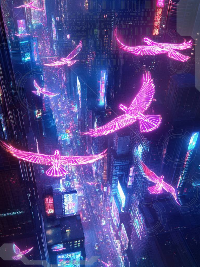 Flight of Neon Dreams offers a breathtaking glimpse into a futuristic metropolis where glowing cybernetic birds soar through the towering skyline. Bathed in an ethereal pink glow, these luminous avian figures create a striking contrast against the cool, digital blues of the city below. The intricate...