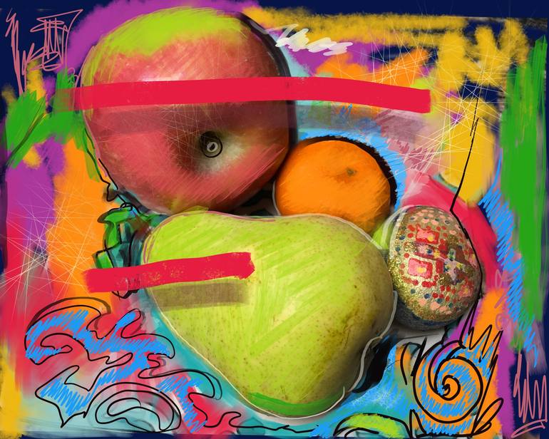 This is a digital painting that I was inspired to make when I viewed the fruit together on a colorful plate. There was a Ukranian Egg with the fruit, and it was a beautiful distraction.