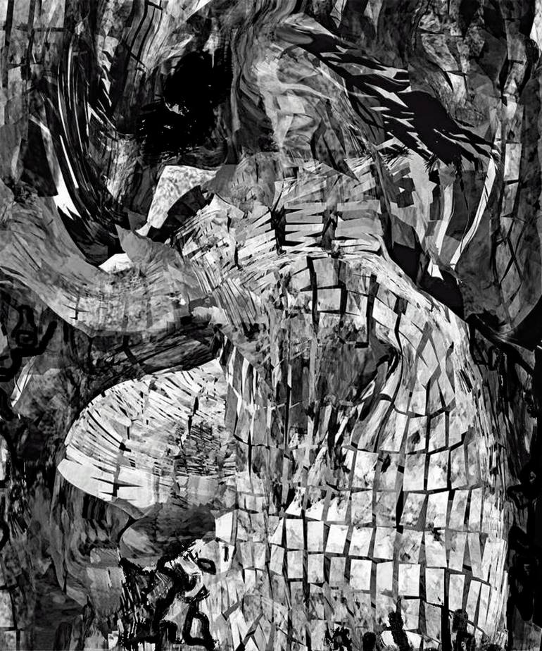 A humanly shaped splintering of white particles, set in an environment of a scattering of black ones, sends a message to bewildered humanity in distress. The work depicts the Earth Mother, Gaia, turned into a fury by humans’ technological hybris and unlimited egocentrism. The work is printed on Ho...
