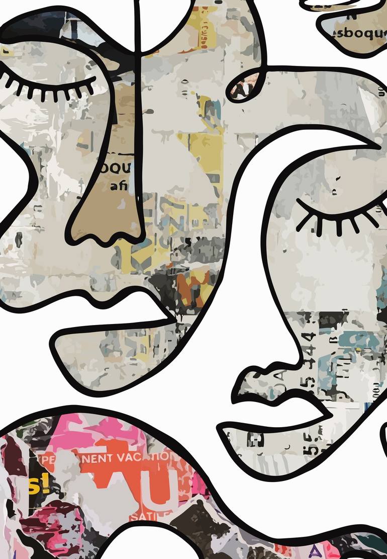 I paint mainly subjects of famous people, celebrities, and icons of pop culture and fashion; faces, figures, comics. My artworks are a combination of Pop Art and Street Art painted on a collage of torn letters from posters and advertisements extracted from the streets, which are digitized and assembled into the final piece. It is definitely modern, radical painting with a visually beautiful language for the viewer. Intense and vibrant colors combine with large splashes of contrasting colors adorned with multicolored French tears. My major influences are Andy Warhol, Roy Lichtenstein, Jackson Pollock, Jacques Villeglé, and Mimmo Rotella. I enjoy working on fairly large formats, ranging from 1.20 to 1.70 meters or larger. I often use different digital techniques, especially when assembling the collages of sources and letters for the abstract backgrounds with torn pieces of paper. I feel a certain fascination for these street paper letters from our poster culture; they function as small testimonies of what surrounds us, and each person randomly interprets them to evoke personal feelings or memories. Taking these letters and fragmenting them in a completely different context than what they originally present on the walls allows me to offer new expectations of interpretation among viewers. The portraits are digitally created in a monochrome palette of 10 to 30 colors, giving a more elegant and avant-garde look to the artwork. Street art, as well as abstract art, play a crucial role in my work. I am fascinated by working with the aesthetics of letters and fonts from torn posters and billboards on the walls of the streets. They are beautiful in themselves; free, vibrant, spontaneous, colorful, exciting, and without rules. I like to create them digitally so that I have the freedom to express myself and channel all my energy inspired by urban beauty. In my paintings, I try to use various techniques to make my digital canvas resemble a painting worn out by the harsh environment it is in. These street resources or supports are always weathered, scratched, and damaged by exposure to rain and the environment. I strive to make it as close as possible to a real urban landscape where everything complements each other in a single homogeneous composition between the painted surface and the collage of street letters. I always start creating the various layers in a spontaneous way, often using a variety of techniques such as collage, painting, and spray drips.