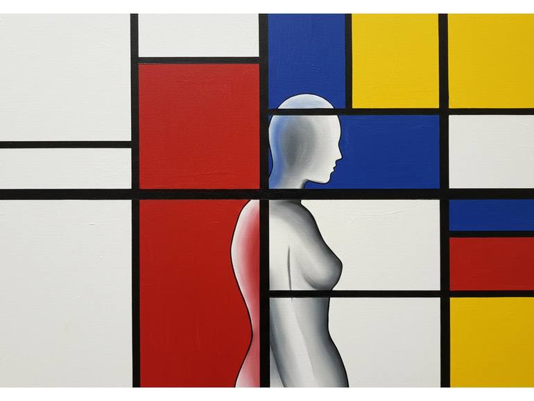 Geometric Eclipse – A Mondrian-Inspired Fusion of Human Form and Abstract Geometry Original Paintings available as Eco-friendly Matte Canvas, Stretched and ready to hang. Landscape size 40X30 Concept: "Geometric Eclipse" in the style of Mondrian-inspired minimalist artwork where the human form subt...