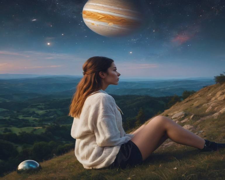 Girl sitting on a hill overlooking the sky, stars planets jupiter