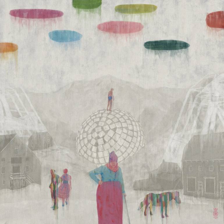 Village people investigate a mysterious giant glitter ball that landed in their village. The prints are made on high quality fine art paper. The print is invisibly bonded behind a panel of museum grade acrylic glass, in a process called face-mounting.
