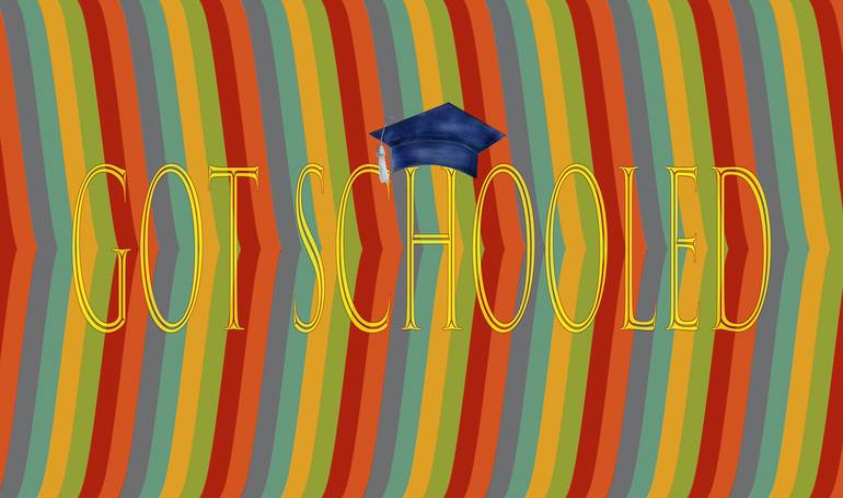 “Got Schooled” is a simple old-style logo image with a simple message about the importance of getting an education in a colloquial styling.