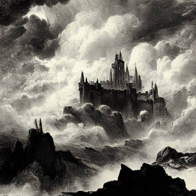 A thematic AI generated image in lithogravure style, for the king on the hill can only go down. Revisiting the theme of strongholds and castles with a more celestial touch. Part 3 of a series of 10 under this theme.