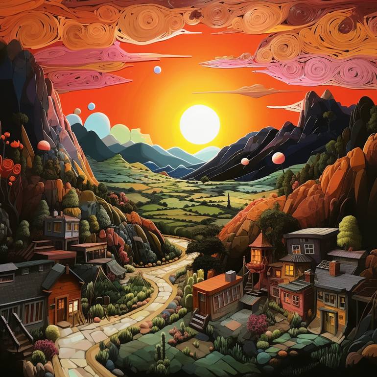 In the enchanting realm of a Funk Art landscape, the evening sun begins its descent, enveloping the surroundings in a soft, warm glow. The scene unfolds with an uncanny twist, as hills rise and fall, but instead of the typical earthy formations, they are composed entirely of everyday objects. Here, ...