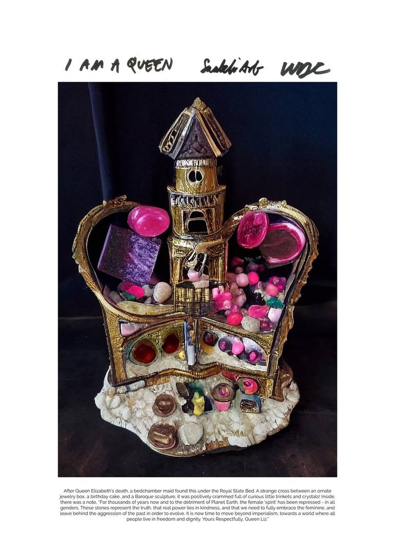 After Queen Elizabeth’s death, a bedchamber maid found this under the Royal State Bed. A strange cross between an ornate jewelry box, a birthday cake, and a Baroque sculpture, it was positively crammed full of curious little trinkets and crystals! Inside, there was a note, “For thousands of years no...