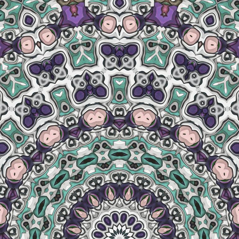 A symmetrical mandala featuring intricate designs in shades of purple, teal, and gray. The patterns create a mesmerizing kaleidoscopic effect with a harmonious blend of colors.