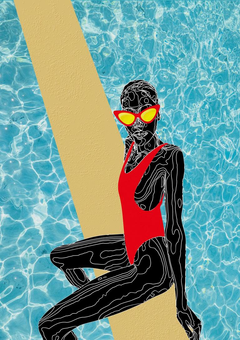 "Kaleidoscope of Calm". Drenched in the nuances of daily existence, this digital masterpiece offers a refreshing glimpse into a woman's tranquil moment amidst the structured chaos of life. The work artfully juxtaposes geometric forms against the fluidity of water, creating a vivid interplay of light...