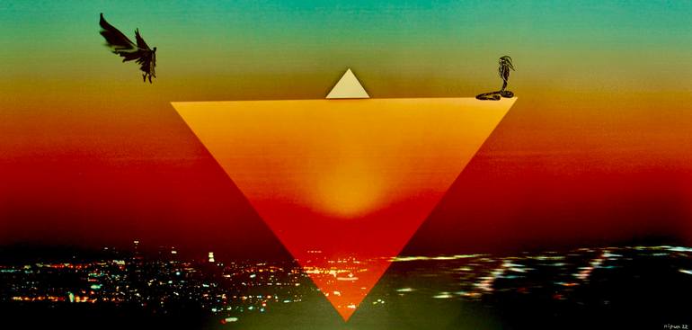 A small triangle atop an inverted larger triangle. An angel on the left and a snake figure on the right. Who has the upper hand? Who is in power?