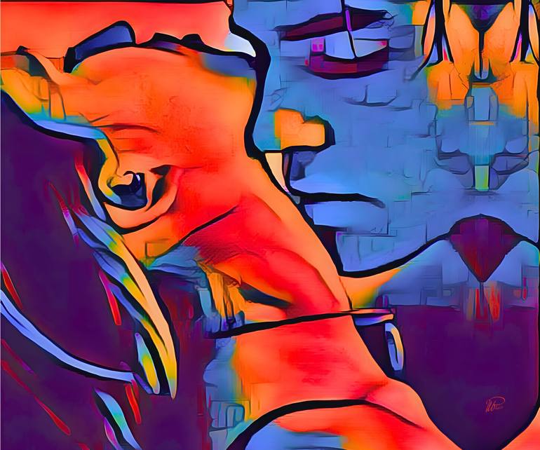 Digital Abstract Art | The Series of "Kissing strangers" Artwork (Series No. 2) | Actual size 7000 × 5835px. A vibrant composition showcases an abstract blend of colors and shapes, highlighting a man and women kissing embraced in a tender interaction. Dominant hues of red, blue, and purple interwea...