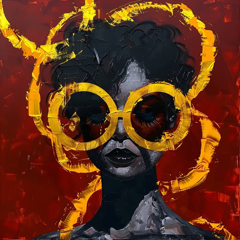 This design was rendered by my own algorithm and then fed into an AI designer to generate this image. The title translates to "Lady Madonna in Circles of Gold". A striking portrait features a person with large, circular yellow-rimmed sunglasses on a rich red background. Bold strokes of yellow paint ...