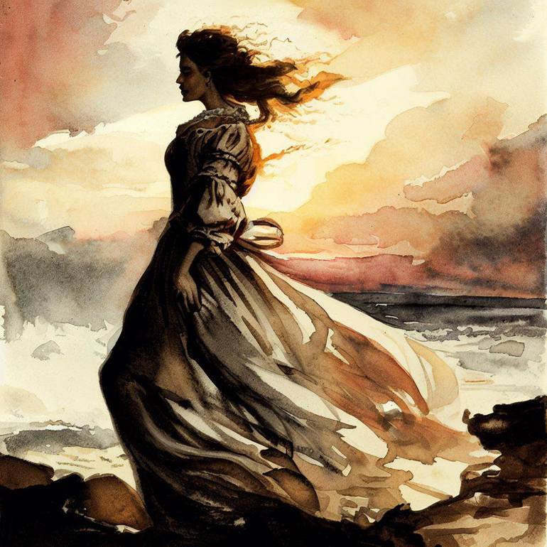 A thematic AI generated image in lithogravure style; a colorized series portraying ladies with their hair wildly in the wind. Part 3 of a series of 10 under this theme.