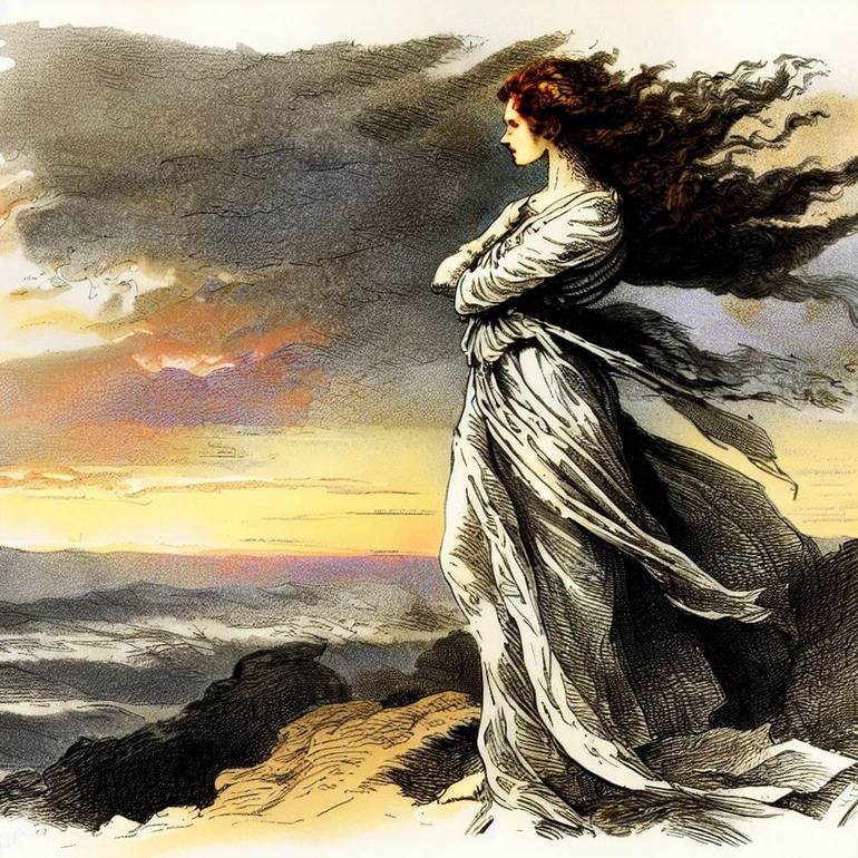 A thematic AI generated image in lithogravure style; a colorized series portraying ladies with their hair wildly in the wind. Part 7 of a series of 10 under this theme.