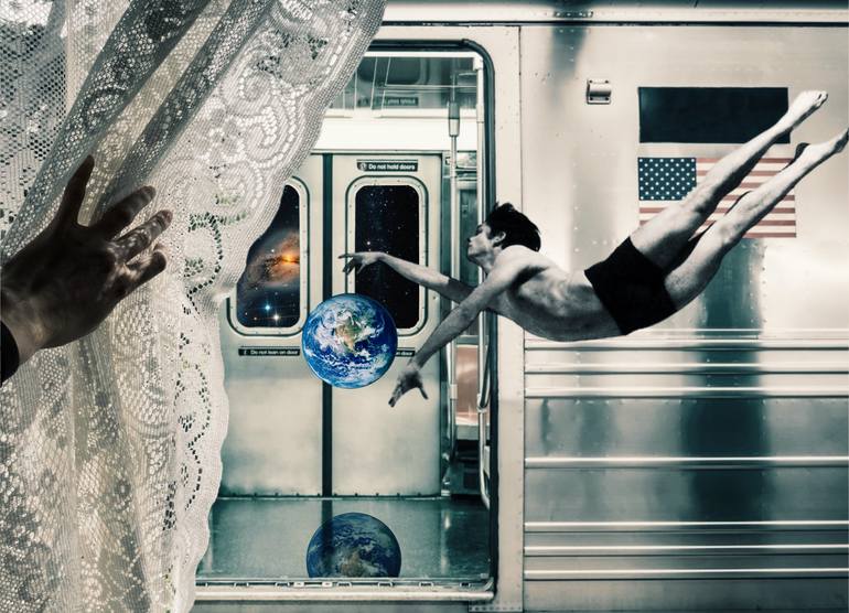 Giclèe Print This piece portrays the last chance to save the world before it exits at the point of no return. The flying human figure represents a desperate yet hopeful attempt to avert disaster. It questions whether humanity can reach and save the world before the doors close, symbolizing the urge...