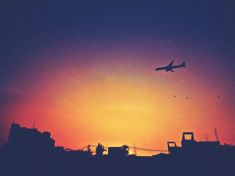 The timing of the plane landing at the time of the sunset and the dark shadow of the building. Overlay the pattern to create a strange feeling.