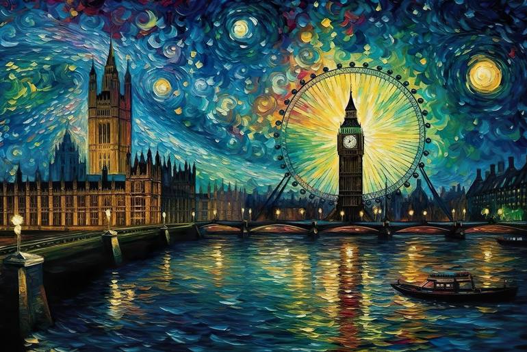 The painting depicts the London skyline, with the Big Ben and the London Eye standing tall against a colorful and dynamic background. The River Thames flows beneath them, reflecting the vibrant colors of the city and creating a sense of movement and depth that draws the viewer into the scene. The To...