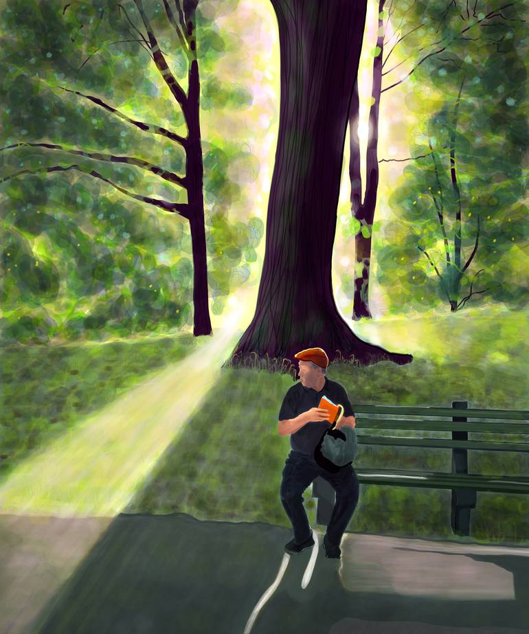This image is drawn freehand on an iPad with an Apple Pencil and is beautifully printed with archival, Epson ink on fine art paper. Only one print will be made. Drawing of a man reading just after sunrise in Prospect Park, Brooklyn.