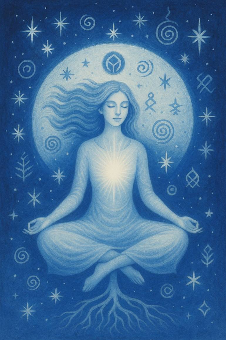 Bring celestial stillness and inner power into your space with this symbolic digital artwork. A serene woman sits in lotus pose, her eyes gently closed, while a radiant light glows from her heart and roots extend from her body to the earth below. Surrounding her are stars, runes, spirals, and a glow...