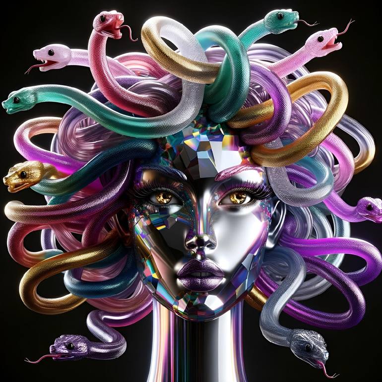 This image presents a Medusa for the digital age, her form reinterpreted as a faceted prismatic structure that reflects light and color with a metallic sheen. It is as if she has been carved from a crystal of infinite faces, each angle revealing a new shade, a new aspect of her enigmatic persona. He...