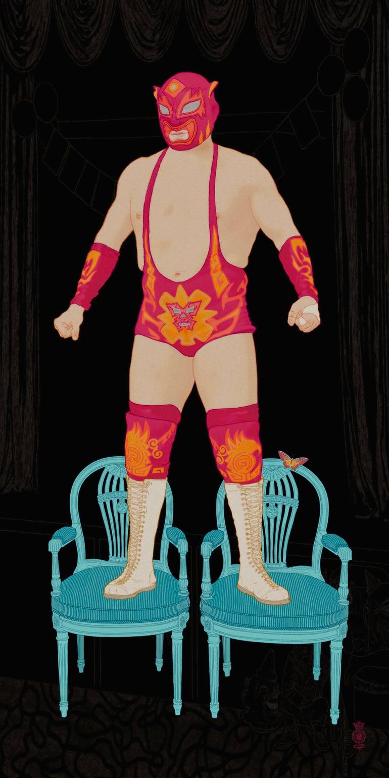 This is an image of a Mexican wrestler in full costume. Standing on two chairs. The prints are made on high quality fine art paper. The print is invisibly bonded behind a panel of museum grade acrylic glass, in a process called face-mounting. Also available in 30"x60" ($2,500), and 18"x36" ($1,200...