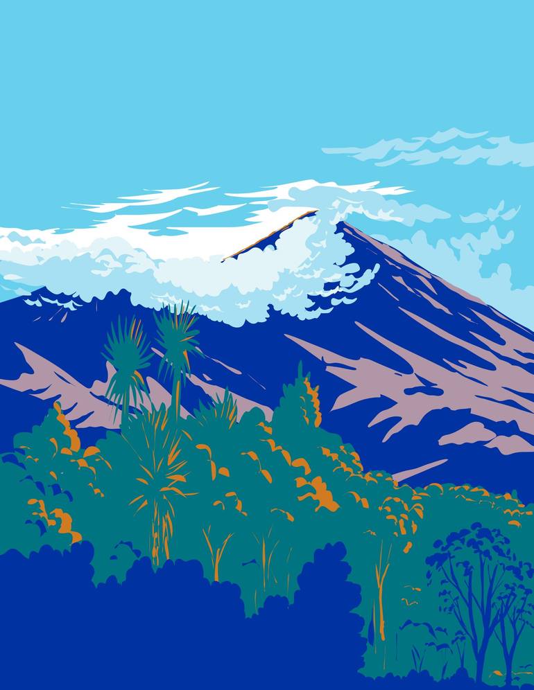 WPA poster art of Mount Taranaki and Fanthams Peak in Egmont National Park located in New Plymouth of the North Island of New Zealand done in works project administration or federal art project style.