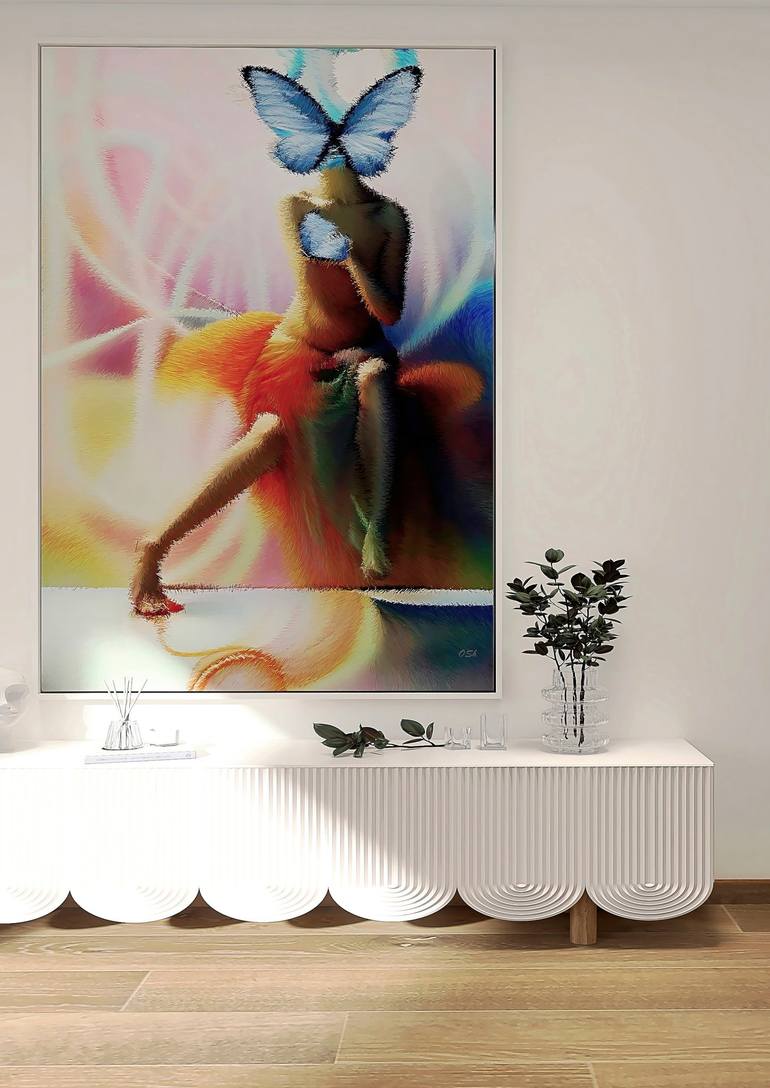 The painting was easy to create. The butterfly is blue on the main background, the girl and her body, the lightness of the paint, the movement of the legs on the floor. Orange skirt. There is a very large size. Surrealism and fantasy fit into A0 size with a resolution of 300 dpi. I will be pleased ...