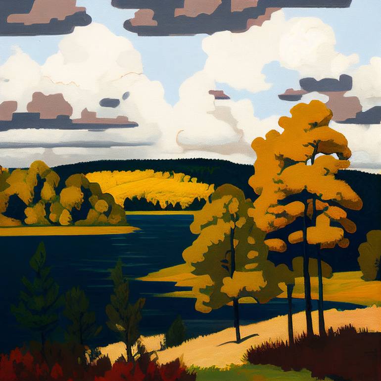 An abstract painting of a Muskoka lake in the early autumn as the trees change colour. The work uses bold fall colours, with slightly abstracted landscape forms and a limited, Ontario fall colour palette to achieve depth and perspective.