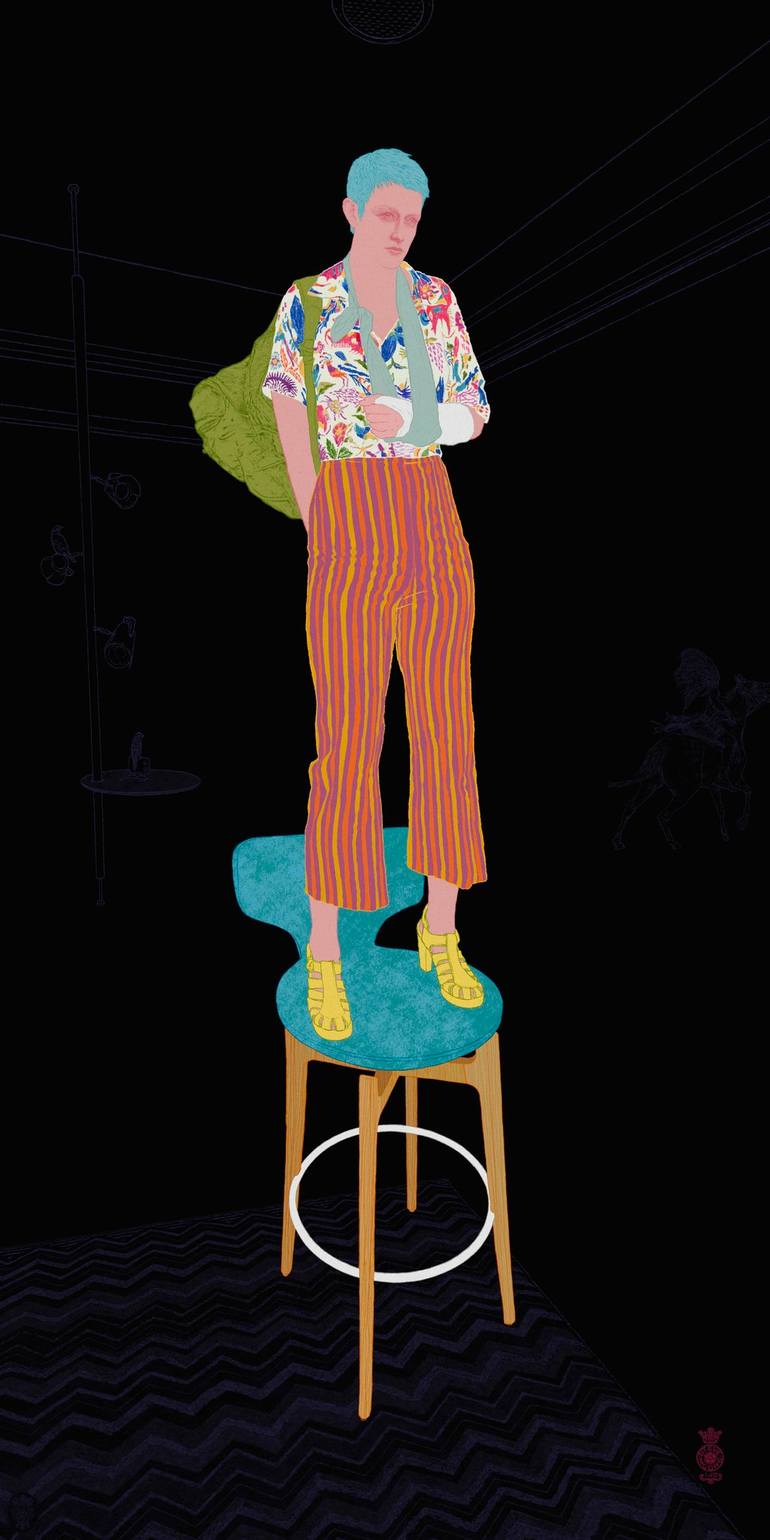 This is an image of a woman standing on a chair. She is wearing colorful clothes, and has dyed blue hair. She is standing on a wooden upholstered stool. In the background is a person riding away on a horse. The prints are made on high quality fine art paper. The print is invisibly bonded behind a p...