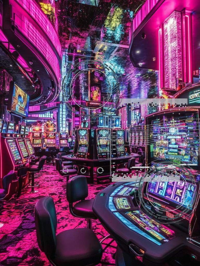 Step into the electrifying world of Neon Gamble, a cyberpunk-inspired casino bathed in a dazzling spectrum of neon pinks, blues, and purples. This artwork captures the essence of a futuristic nightlife where high-stakes gaming meets digital opulence. Rows of slot machines and gaming tables glow unde...