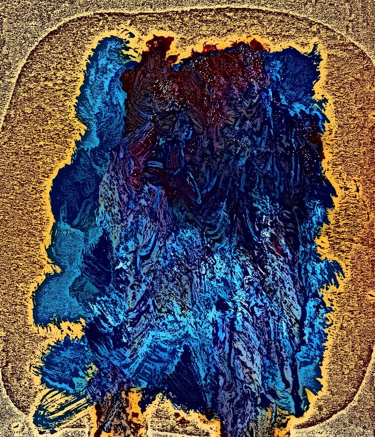 The artwork titled "New" captivates the viewer with its dynamic interplay of colors and textures, creating an abstract representation that evokes a sense of mystery and exploration. The piece is dominated by deep, rich blues and purples, interspersed with hints of red and lighter blue tones. These c...