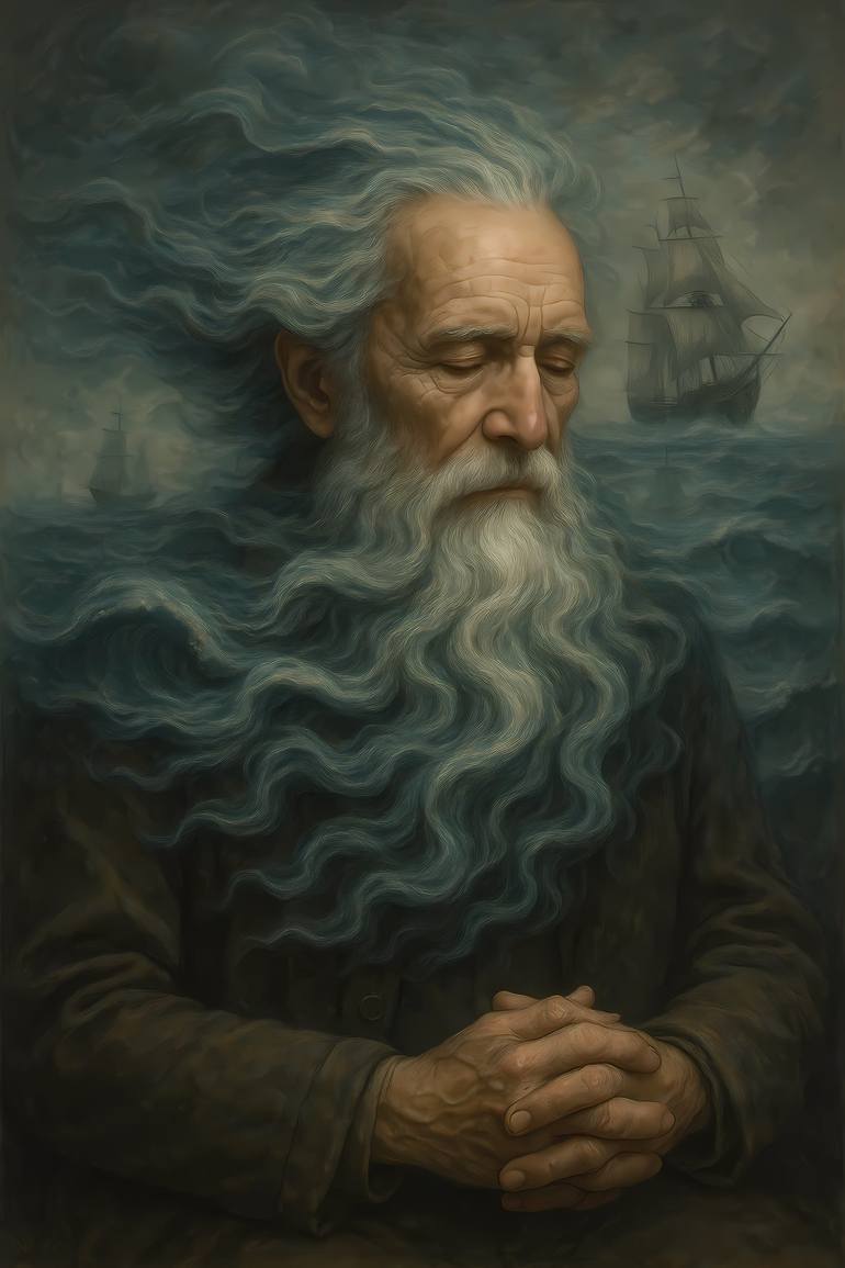 This evocative portrait captures a weathered elder whose long, flowing beard seamlessly becomes the very sea itself—an embodiment of wisdom shaped by time and tide. The texture of his skin mirrors stormy skies, while distant ships sail through his oceanic presence, suggesting a life filled with jour...