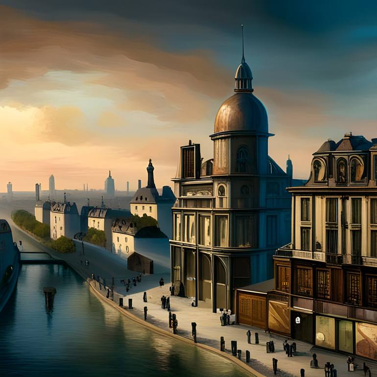 Oil painting of Paris in 1950. The golden age. A world of dreams