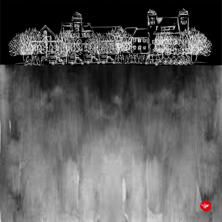 Black and white digital sketch of the old city landscape, drawing and painting series.