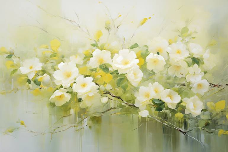The painting depicts a delightful branch of cherry blossoms. A delicate stem covered with graceful flowers permeates the space with its fragile beauty. It seems that a gentle breeze with cetaceans is on the surface of clean, transparent water. Sakura flowers are lush, double, blooming. All this cre...