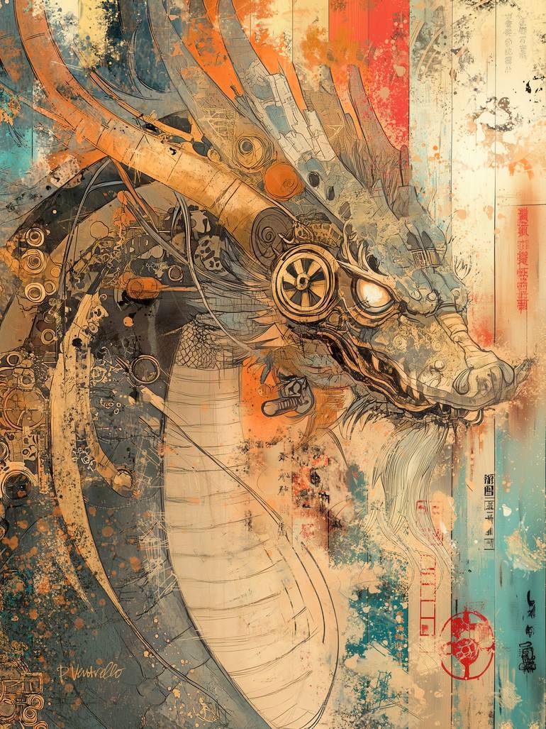 This artwork is a striking and complex abstract piece that blends mechanical and organic elements in a vibrant, textured composition. The color palette is dominated by warm oranges and earthy browns, balanced with cooler blues and teals, creating a dynamic contrast. The focal point is an oriental ...
