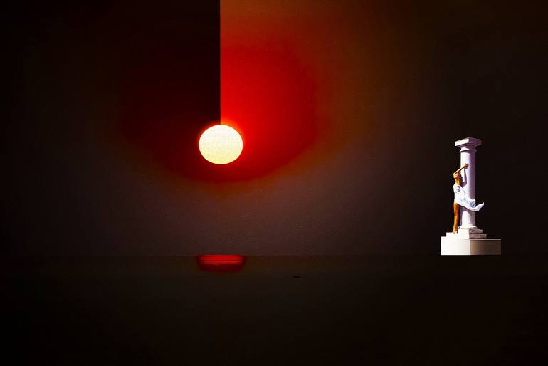 A minimalistic scene features a dancer poised against a column bathed in light on the right, while a large red and white sun dominates the left side. The dark background contrasts with the brightness of the sun and sculpture, creating a striking visual effect. A digital - creative photography f...