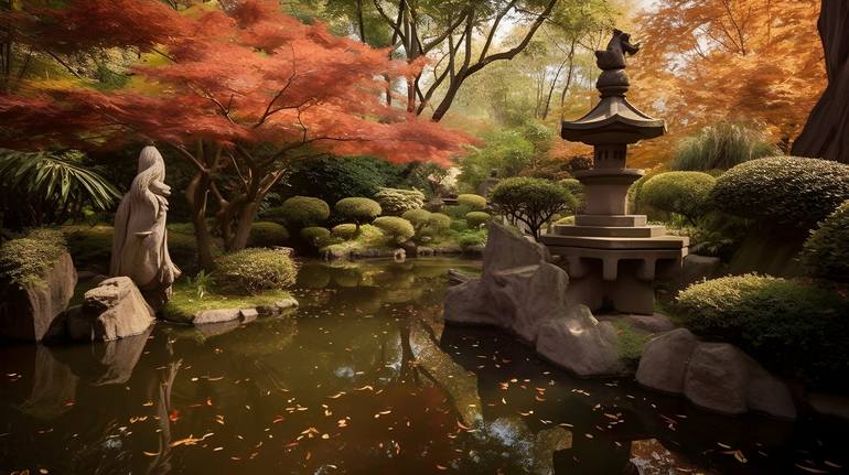 I aimed to blend the warmth of wood carving with the delicate nuances of painting to capture the serene beauty of a Japanese garden in autumn. This painted mahogany wood sculpture, 'Autumn Harmony,' features a koi pond and a bamboo fountain, evoking the tranquil essence of fall within a traditional ...