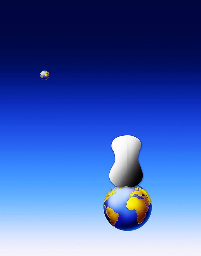 A stylized globe of Earth is positioned at the bottom, with a smooth, abstract shape on top, set against a gradient blue background. Another smaller globe appears in the top left corner, suggesting perspective. For sale as Limited-Edition of 30 Fine art prints on Metal H 80 x W 62.5cm $ 900 - plus ...