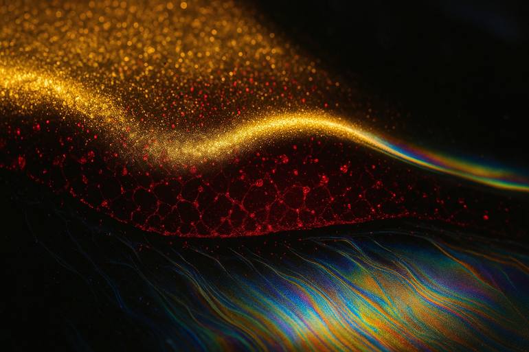 Nanogold dunes crest over a spectrum undercurrent. Light behaves like fluid, revealing hidden data currents inside metallic grains.